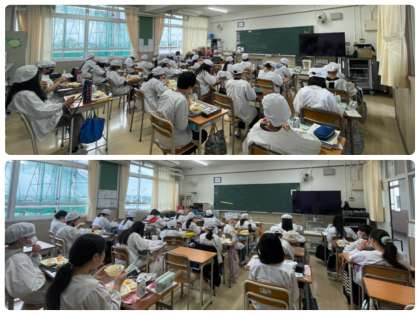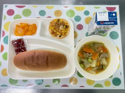 今日の献立は、豚肉と野菜のカレースープ煮・変わりピザ・みかん(缶)・大型コッペパン・いちごジャム・牛乳です。
