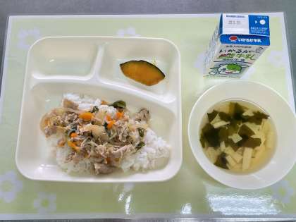 今日の献立は、豚丼・湯葉のすまし汁・かぼちゃのしょうゆ焼き・ごはん・牛乳です。