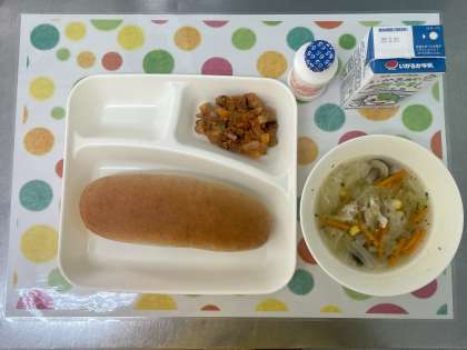 今日の献立は、じゃがいものミートグラタン・スープ・発酵乳・黒糖パン・牛乳です。