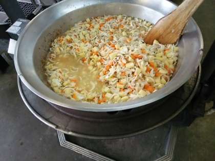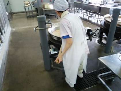 給食調理員さんが、大きな鍋で約400人分のカレーを作りました。