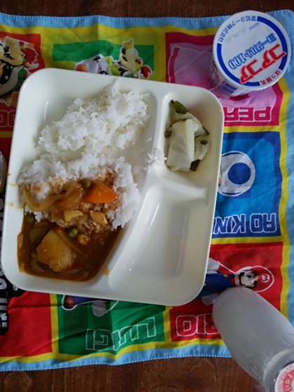 今日の献立は、チキンカレーライスとキャベツと三度豆のサラダ、ヨーグルトです。