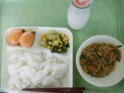 米飯・牛乳・マーボーはるさめ・チンゲンサイとコーンの甘酢あえ・びわです。