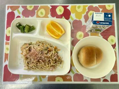 今日の献立は、和風焼きそば・オクラの甘酢和え・オレンジ・黒糖1/2クレセントパン・牛乳です。