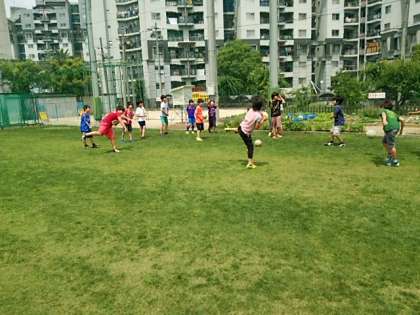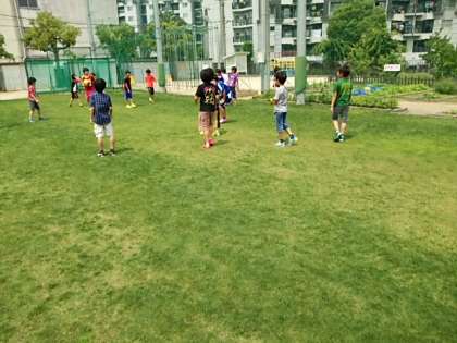 休み時間になると、芝生で遊ぶ人が増えます。今日もドッジボールで遊んでいました。