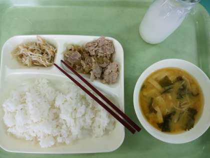 米飯・牛乳・豚肉の甘辛焼き・みそ汁・もやしのごま酢あえです。