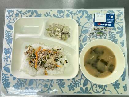 今日の献立は、豚ひき肉とにらのそぼろ丼・みそ汁・キャベツの赤じそ和え・ごはん・牛乳です。