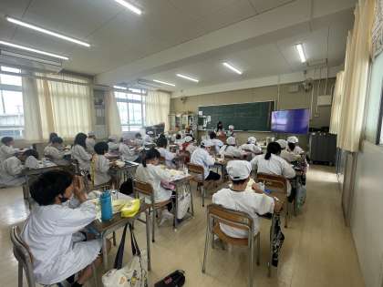 今日から給食週間が始まりました。給食時間に献立の紹介や食べものにまつわるクイズを放送しました。
