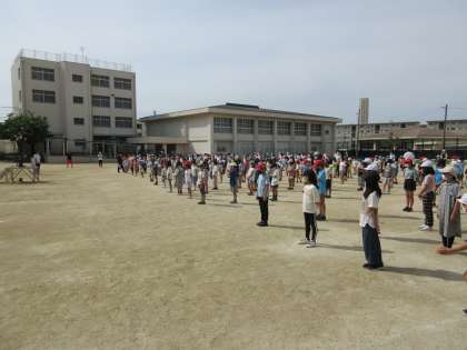 今朝は児童朝会があり、学級ごとに十分な距離をとって整列して行いました。