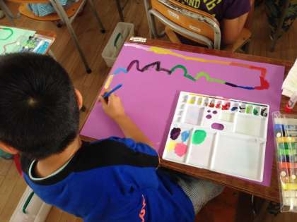 児童は何色と何色を混ぜたら何色になるのか、興味津々です。