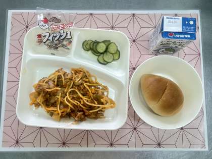 今日の献立は、スパゲッティミートソース・きゅうりのピクルス・アーモンドフィッシュ・黒糖1/2パン・牛乳です。