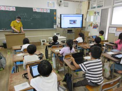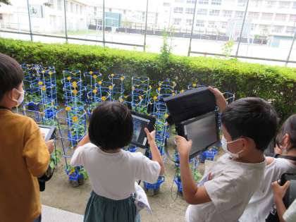 1年2組は、タブレット端末を使ってあさがおの写真を撮り、スカイメニューの発表ノートに貼り付けて自分が撮った写真を見返したりしました。