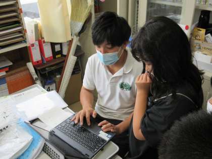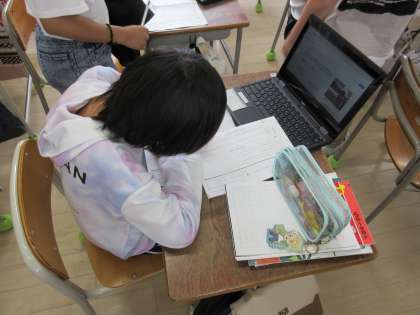 今日は、教室で一人一台端末を用いて様々な環境問題を調べ、ワークシートに書き込んだり新聞にまとめるために印刷する資料のデータを、先生のパソコンから職員室のプリンターに転送したりしていました。