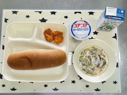 今日の献立は、えびのチリソース・中華スープ・ヨーグルト・黒糖パン・牛乳です。