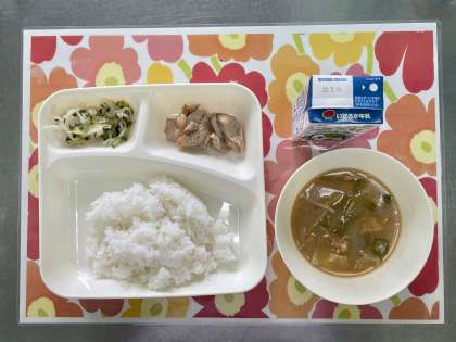 今日の献立は、鶏肉のしょうゆマヨネーズ焼き・とうがんのみそ汁・切り干し大根のゆずの香あえ・ごはん・牛乳です。