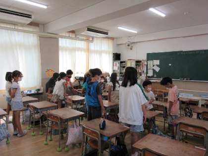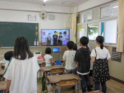 今日の児童集会は、集会委員会が出題するクイズに班のみんなで協力し合い回答するクイズゲームで、正解すると進化する「進化ゲーム」でした。