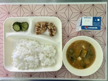 今日の献立は、豚肉のたつたあげ・みそ汁・きゅうりの甘酢づけ・ごはん・牛乳です。