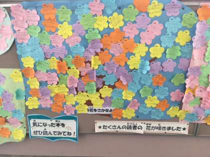 先月の読書週間の時に、1冊の本を読む毎に1枚の花を木の周りに張り付けていきました。