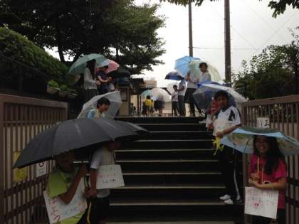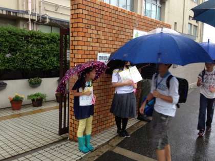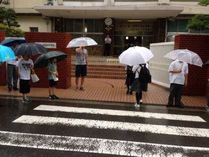 今朝は雨が大変強かったですが、雨ニモマケズ朝のあいさつをしていました。