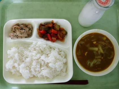 米飯・牛乳・鶏肉のバジル焼き・カレースープ・夏野菜のベーコンソテーです。