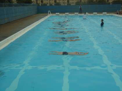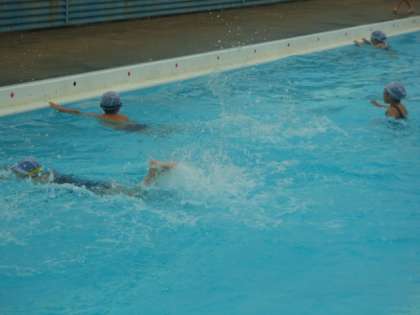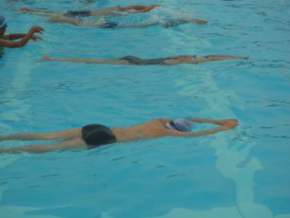 息継ぎをしながらプールの横約10メートルの距離を泳ぐ練習をしました。