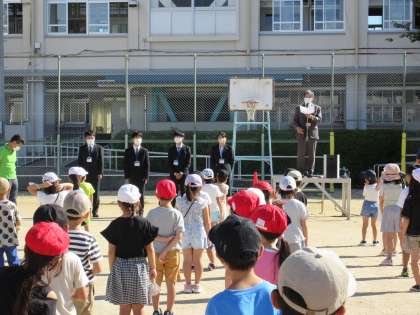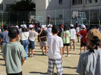 今日は、朝からよい天気だったので運動場で児童朝会をしました。