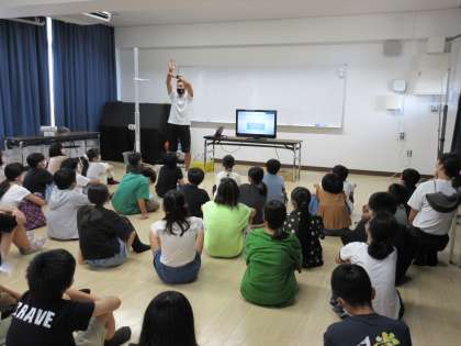はじめに、多目的室で水難事故等にあったときに身を守る方法などについての話を聞きました。