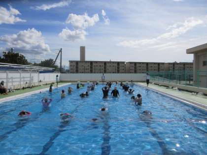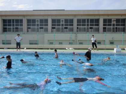 着衣水泳とは、水難事故への対処の方法を身につけるために、服を着ながら泳いだり浮いたりする学習です。