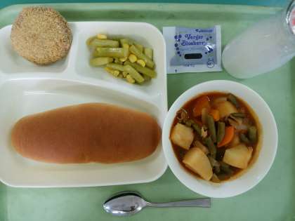 パン・牛乳・チキンレバーカツ・ケチャップ煮・グリーンアスパラガスのサラダ・ブルーベリージャムです。