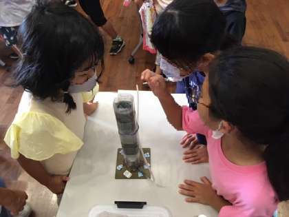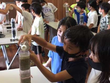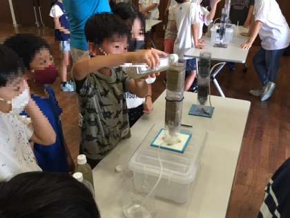 その後、それぞれの学級ごとにグループに分かれて、砂と活性炭を使ったろ過の実験を体験しました。教科書だけでは知ることのできない知識を身につけることができました。