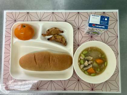 今日の献立は、あげぎょうざ・鶏肉ととうがんの中華煮・冷凍みかん・黒糖パン・牛乳です。