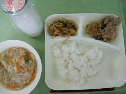 米飯・牛乳・豚肉とピーマンのしょうが焼き・にゅうめん・もやしときゅうりのおひたしです。