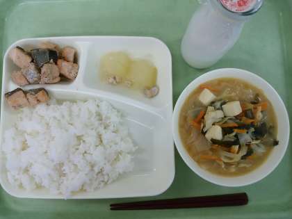 米飯・牛乳・さけのつけ焼き・みそ汁・とうがんの煮ものです。
