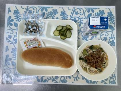 今日の献立は、タンタンめん・きゅうりの甘酢づけ・ミニフィッシュ・大型コッペパン・アプリコットジャム・牛乳です。