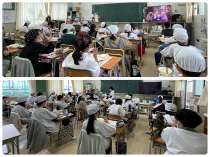 給食のタンタンめんは、チンゲン菜などの野菜やめんが入った汁めんの上に、味付けした肉みそをのせて食べます。