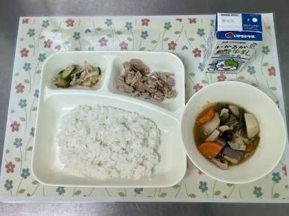 今日の献立は、豚肉のねぎじょうゆ焼き・ふきよせ煮・きゅうりともやしの甘酢あえ・ごはん・牛乳です。