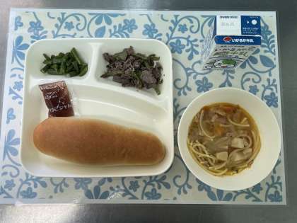 今日の献立は、牛肉の香味焼き・ほたて貝とトマトのスープスパゲティ・さんどまめのサラダ・大型コッペパン・いちごジャム・牛乳です。