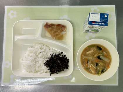 今日の献立は、あかうおのみぞれかけ・みそ汁・牛ひじきそぼろ・ごはん・牛乳です。
