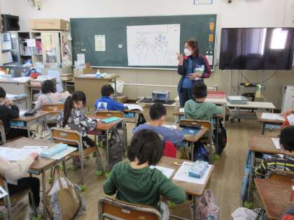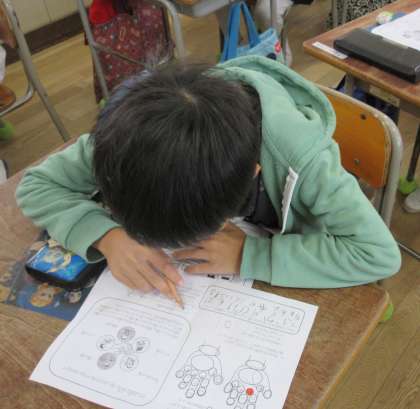 今日、手洗いチェックをした学級をのぞくと、洗い残しが多かった部分にシールを貼っていました。爪や指の付け根の洗い残しが多いことが分かりました。