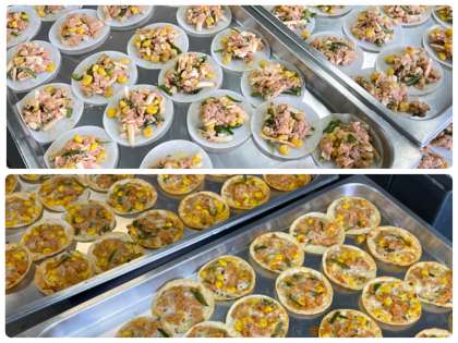 給食の変わりピザは、ぎょうざの皮にツナ、コーン、ピーマン、ピザソース、チーズを混ぜ合わせた具をのせ、やきもの機で焼いてます。