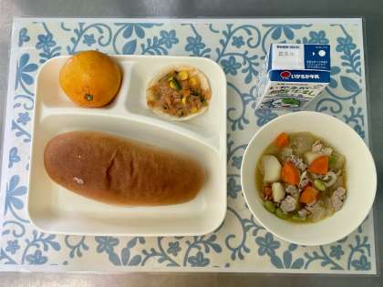 今日の献立は、豚肉と野菜のスープ煮「・変わりピザ・みかん・黒糖パン・牛乳です。