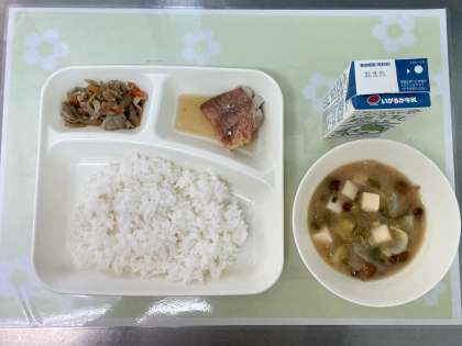 今日の献立は、赤魚のしょうゆだれかけ・なめこのみそ汁・きんぴらごぼう・ごはん・牛乳です。