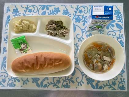 今日の献立は、豚肉と野菜のソテー・スープ・スイートポテト・大型コッペパン・マーガリン・牛乳です。