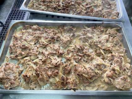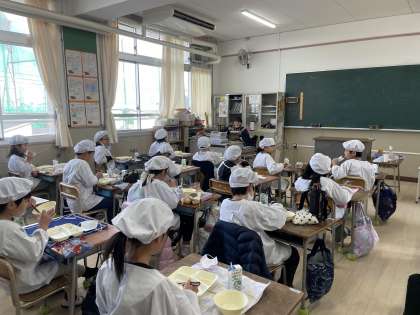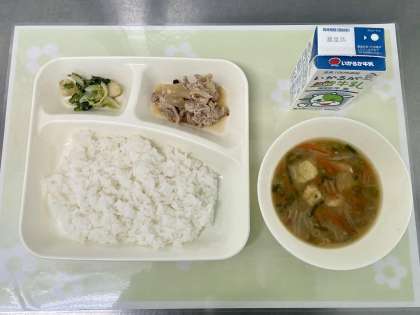 今日の献立は、豚肉のしょうが焼き・さつまいものみそ汁・きくなとはくさいのごまあえ・ごはん・牛乳です。