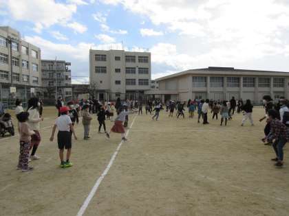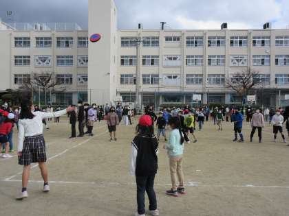 今日から15分休みに運動場でたてわりドッチビー大会が始まりました!