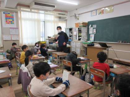 1年1組の教室では音楽の授業で、校歌の練習をしていました。一人ずつラミネートされた校歌の歌詞を大事そうに手に取っていました。