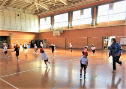 1年2組は体育館で縄跳びの学習をしていました。短縄を床に置いて前後跳びや左右跳びに挑戦し、縄を跳ぶ感覚をつかんでいました。