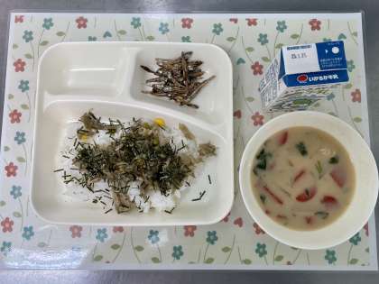 今日の給食は、きんぴらちらし・ぞう煮・ごまめ・ごはん・牛乳です。