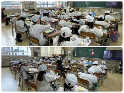 今日の給食では、なにわの伝統野菜であるきんときにんじんを使用したぞう煮と、豊作の願いが込められているごまめが出ました。