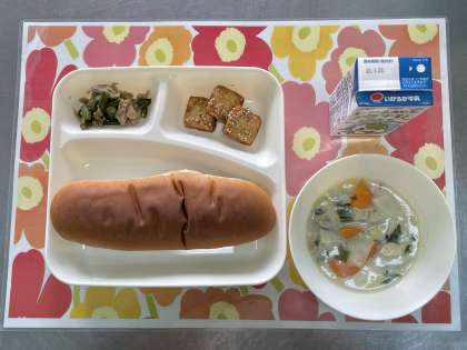 今日の給食は、はくさいのクリーム煮・あつあげのごまじょうゆかけ・豚肉とさんどまめのオイスターソースいため・黒糖パン・牛乳です。