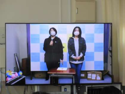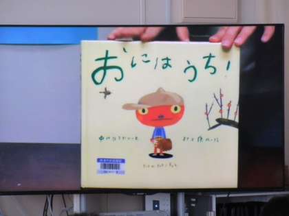 今日の朝の読み聞かせは、「がっこうにまにあわない」と「おにはうち」という絵本でした。